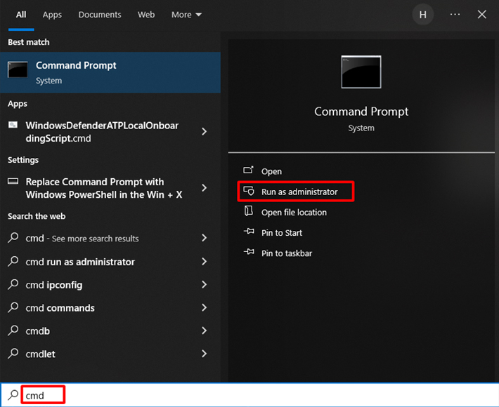 - Trong thanh tìm kiếm của Windows, nhập “cmd” (Command Prompt), nhấp chạy với quyền Quản Trị Viên (Run as Admistrator) như hình.