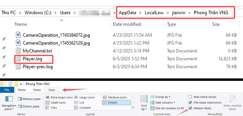 - Bước 3: Nếu đã thực hiện nhưng chưa thành công, nhờ đạo hữu lấy tệp tin Player.log theo đường dẫn này trên máy tính cá nhân: Users >> Folder tên user >> AppData >> LocalLow >> jianxin >> Phong Thần VNG >> Player.log. Sau đó, gửi file player.log đã lấy về Fanpage Phong Thần VNG hoặc trang Chăm Sóc Khách Hàng để được hỗ trợ cụ thể.