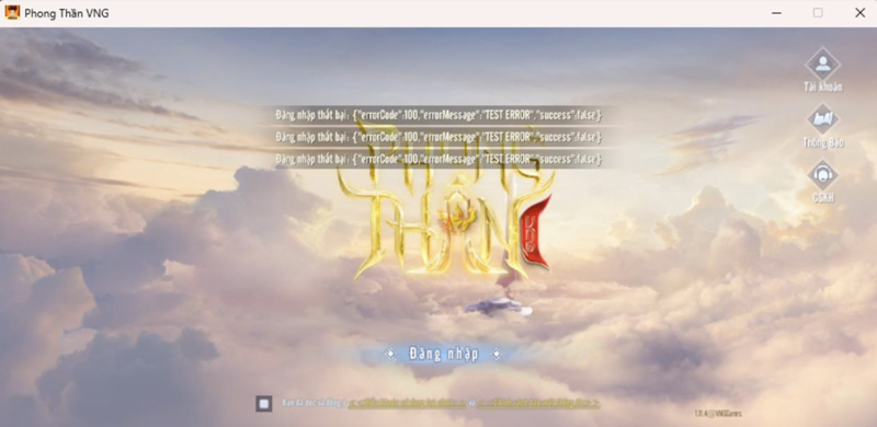 - Sau khi mở game Phong Thần VNG từ launcher Level Up, nhấp chơi game, cửa sổ game hiện lên đến màn hình đăng nhập, và báo lỗi, khiến người chơi không thể đăng nhập vào game.