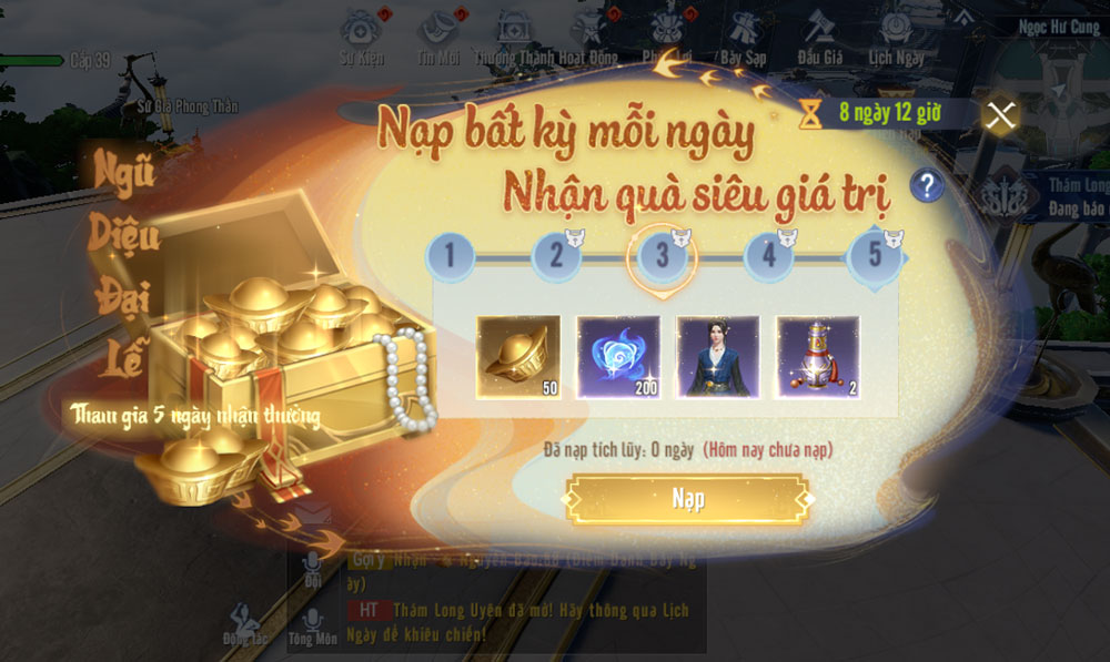 - Trong thời gian diễn ra sự kiện, người chơi khi nạp tích lũy 1 ngày, 2 ngày đến 5 ngày đều nhận được phần thưởng tương ứng.