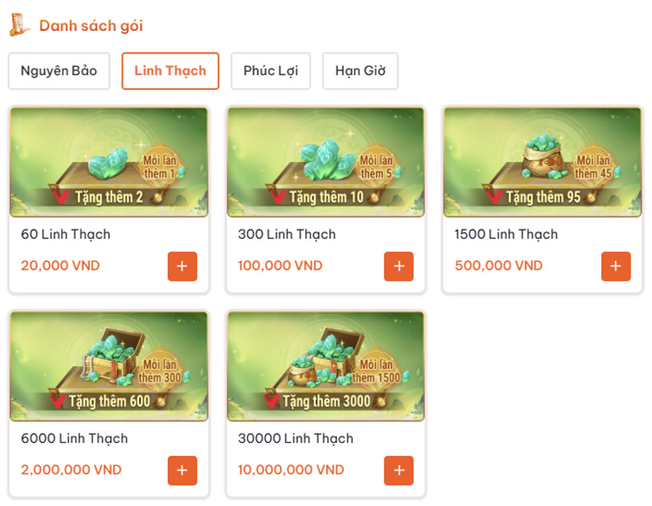 | 6000 Linh Thạch | 2,000,000 | 600 Nguyên Bảo |