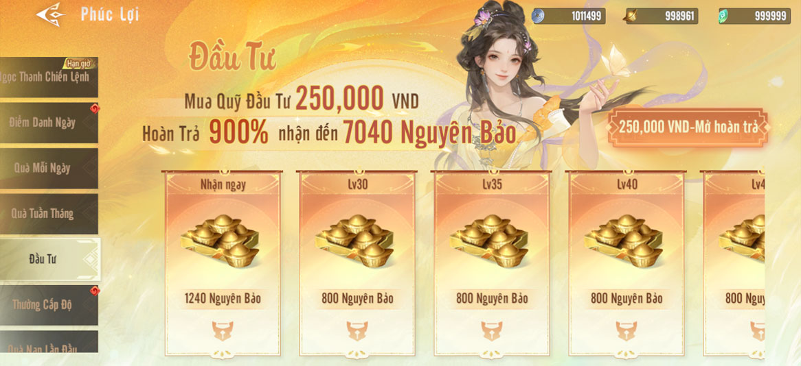 | Sở hữu gói Đầu Tư 1 sẽ nhận ngay | 1240 Nguyên Bảo |