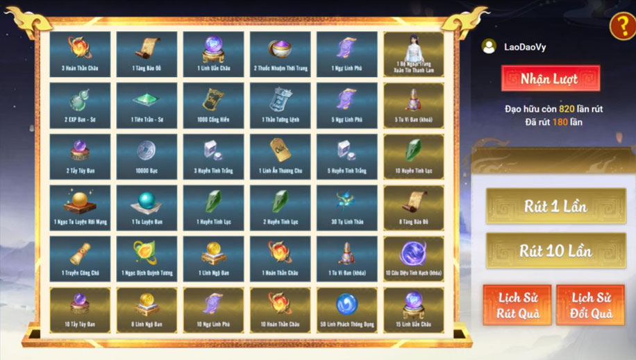 - Người chơi có thể xem lại lịch sử trúng thưởng của mình tại nút Lịch Sử Rút Quà.