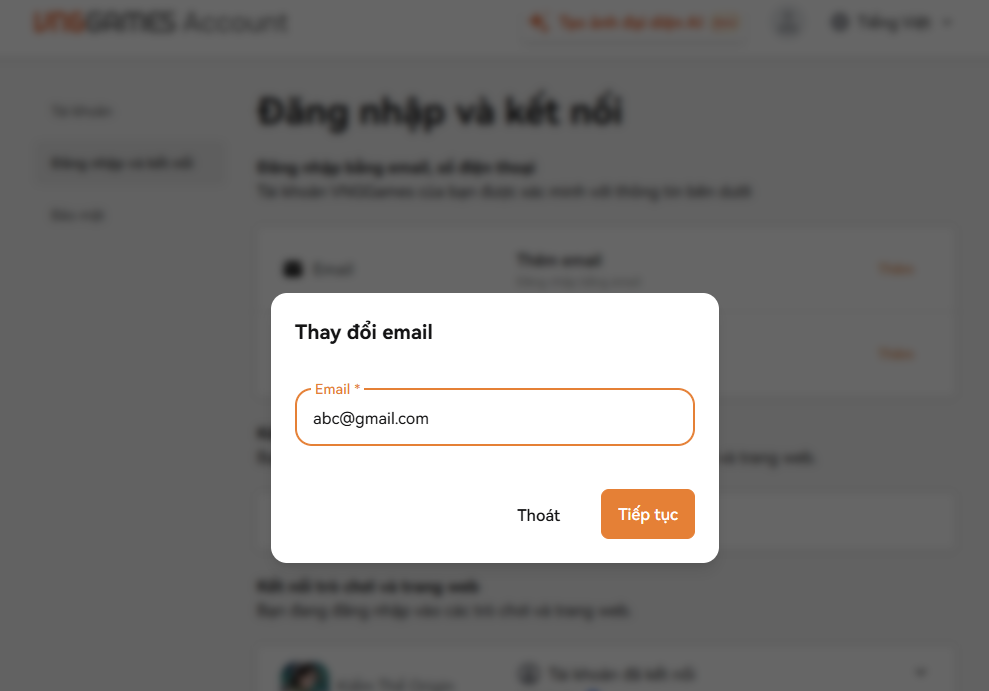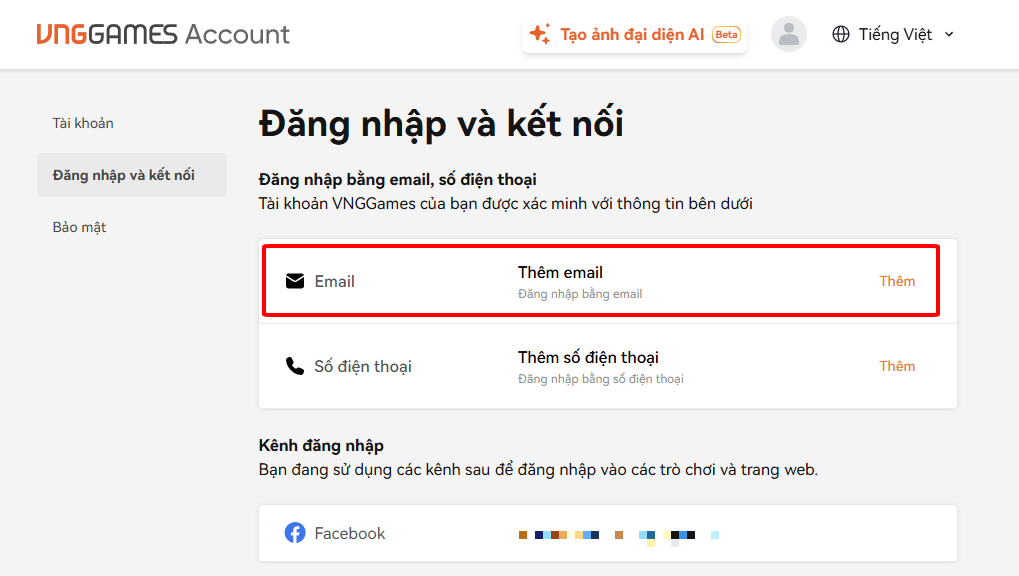- Bước 2: Tại mục Đăng Nhập Và Kết Nối → Email, đạo hữu có thể nhập Email cá nhân để thực hiện liên kết.