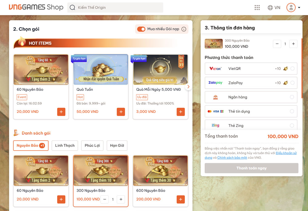 | 300 Nguyên Bảo | 100,000 | 10 Nguyên Bảo |