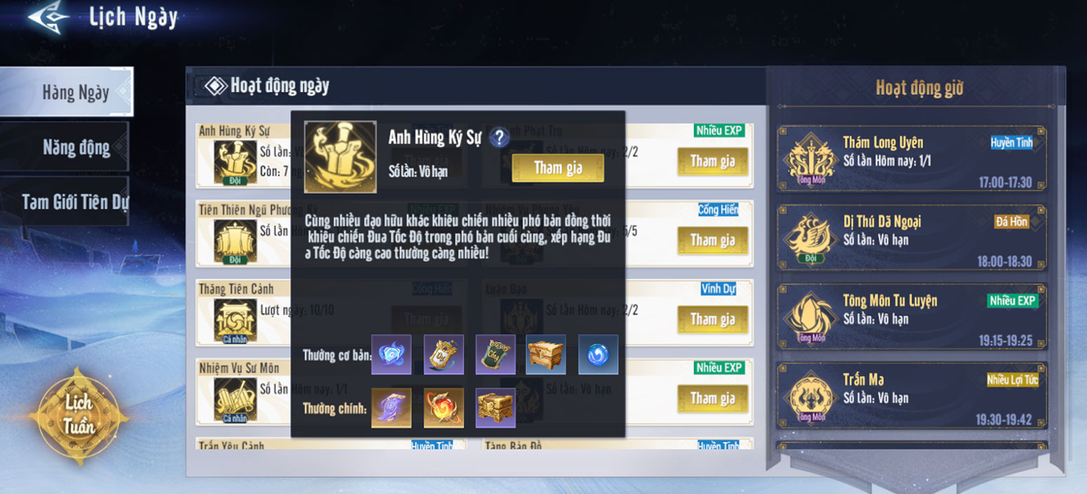 - Khi máy chủ đủ điều kiện mở hoạt động, đạo hữu có thể tham gia thông qua giao diện Lịch Ngày - Anh Hùng Ký Sự.