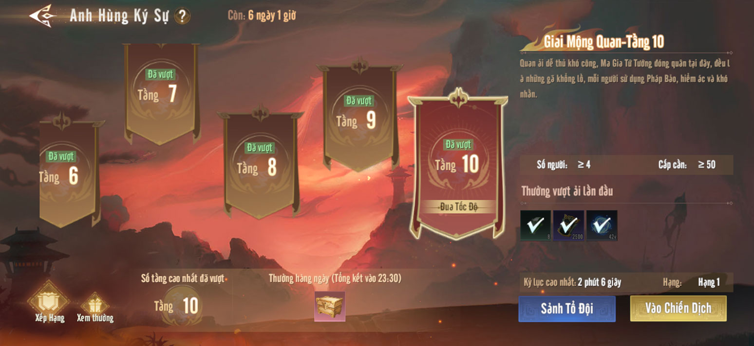- Kết thúc khiêu chiến Tầng 10, dựa vào thời gian hoàn thành, 40 đạo hữu có thời gian vượt ải ngắn nhất sẽ được xếp hạng trên Bảng Xếp Hạng Đua Tốc Độ - Anh Hùng Ký Sự. Thời gian vượt ải càng ngắn, xếp hạng càng cao.