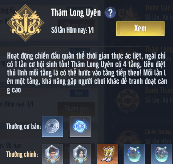 - Thám Long Uyên: người chơi có cơ hội nhận được Thần Ấn Na Tra và Thần Ấn Từ Hàng khi tham gia hoạt động. Ngoài ra đối với tầng 2, 3, 4 sẽ có cơ hội nhận được Mảnh Thần Ấn.