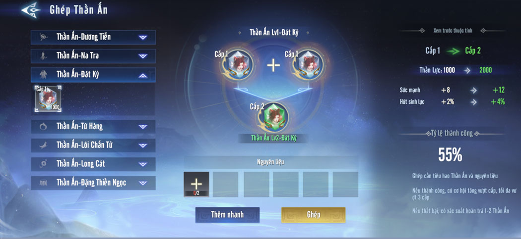 - Người chơi có thể chọn Thần Ấn cùng loại để tiến hành ghép, với tỷ lệ thành công 55%.